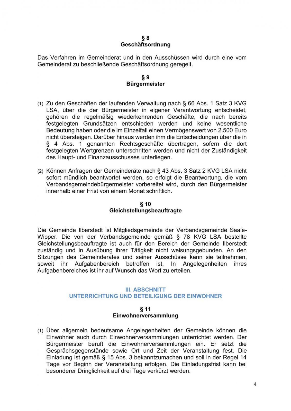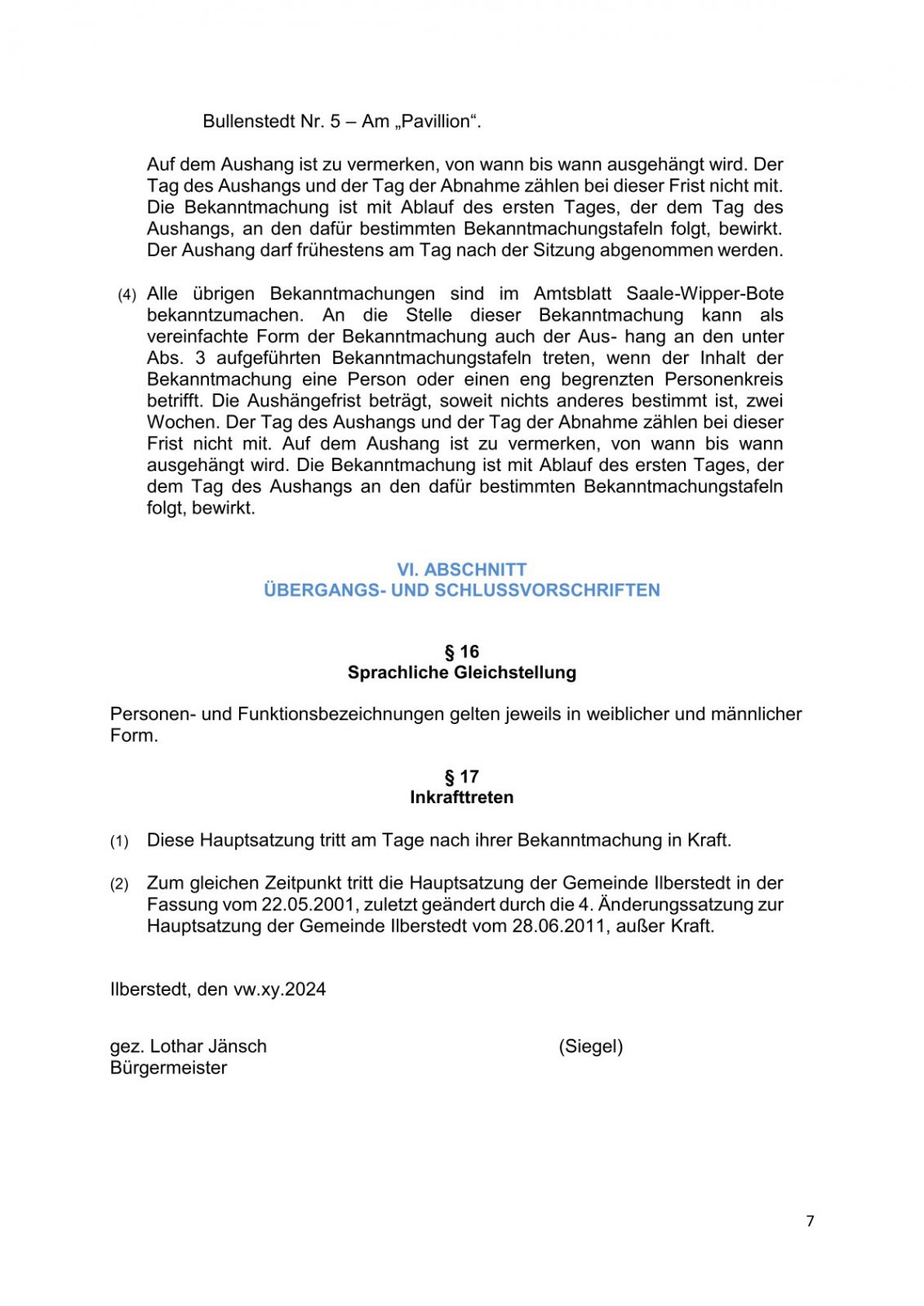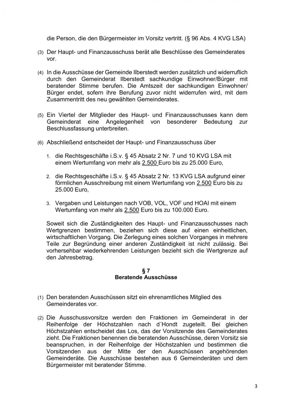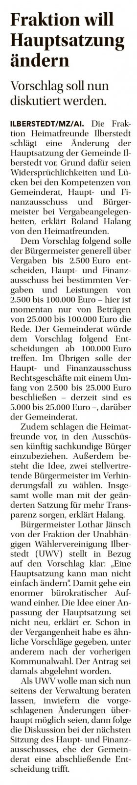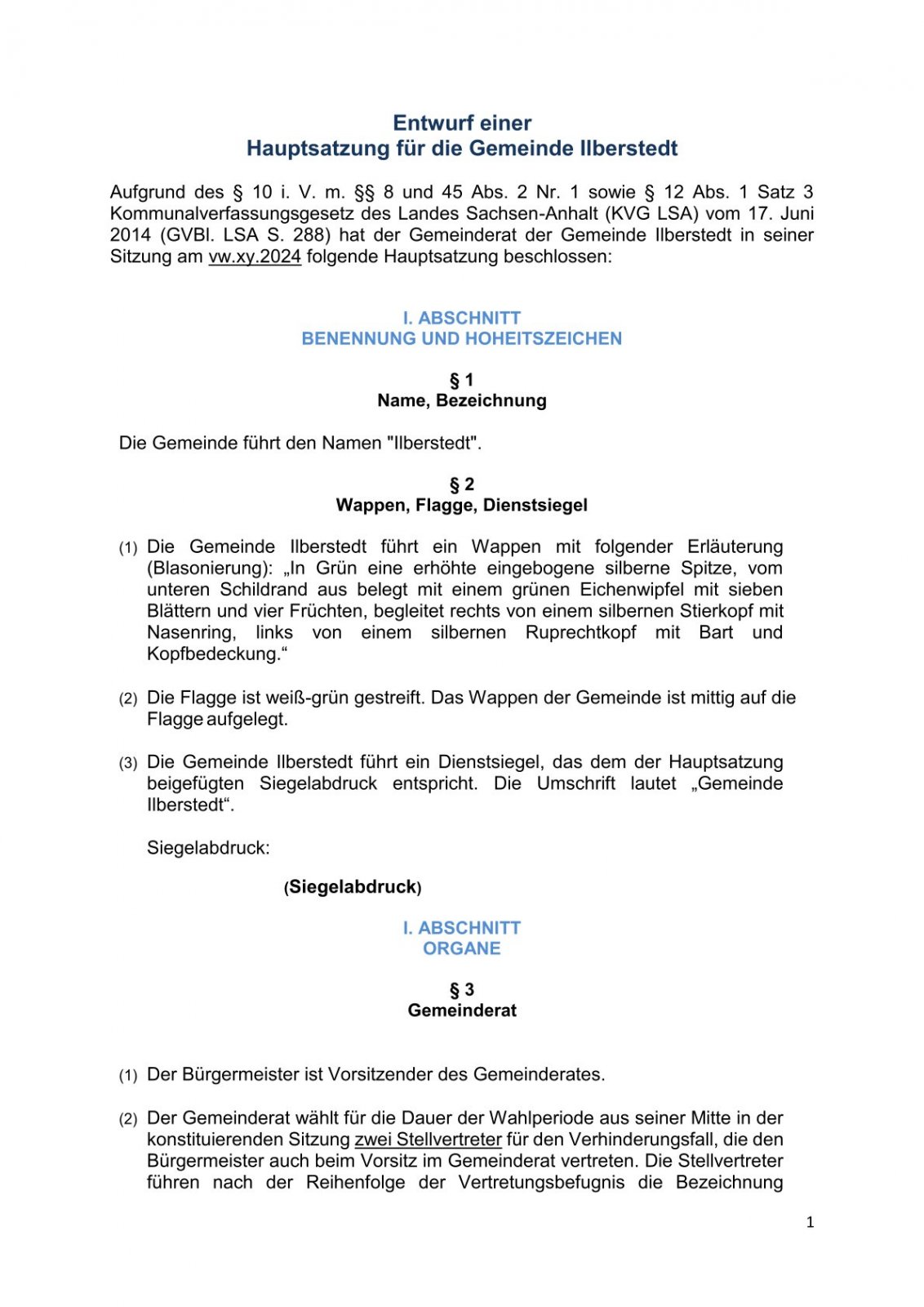 Die Fraktion Heimatfreunde Ilberstedt schlägt die Neufassung der Hauptsatzung der Gemeinde Ilberstedt in der konstituierenden Gemeinderatssitzung vor. Neu ist, dass es zwei stellvertretende Bürgermeister geben soll, dass alle Beschlüsse des Gemeinderates vorher im Haupt- und Finanzausschuss vorberaten werden müssen und dass die finanziellen Kompetenzen des Gemeinderates, des Haupt- und Finanzausschusses und des Bürgermeisters eindeutig und klar, vor allem widerspruchsfrei und damit gesetzteskonform geregelt werden.
