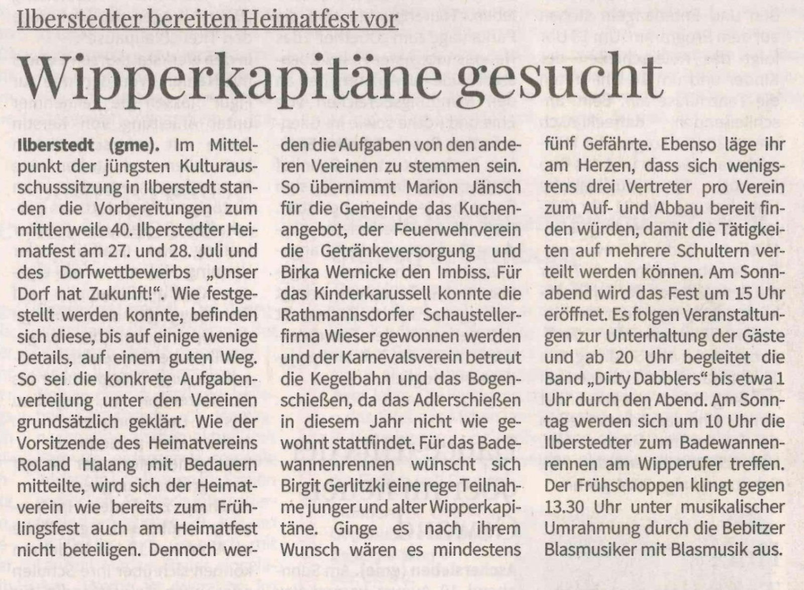 der Berichterstatter des Artikels aus der Ausschusssitzung, Herr Kurt Kuchinke, hat in seiner Berichterstattung bedauerlicherweise zwei Fehlannahmen getroffen bzw. wichtige Hintergrundinformationen nicht erwähnt: Bedauerlicherweise kann der Heimatverein mit seinem Mitgliederbestand, von denen sehr viele Mitglieder bereits in einem stattlichen Alter sind, das Frühlingsfest nicht mehr alleine durchführen, schon gar nicht, wenn die Rahmenbedingungen durch die Gemeinde zusätzlich erschwert werden. „Wir schaffen das nicht mehr alleine“. Immerhin haben wir 16 Heimatfeste alleine organisiert und durchgeführt. Im Jubiläumsjahr zum 1.000-jährigen Tanzwunder wurde das Frühlingsfest erstmalig als Gemeinschaftsaktion des Ilberstedter Organisationskomitees für das Festjahr durchgeführt.